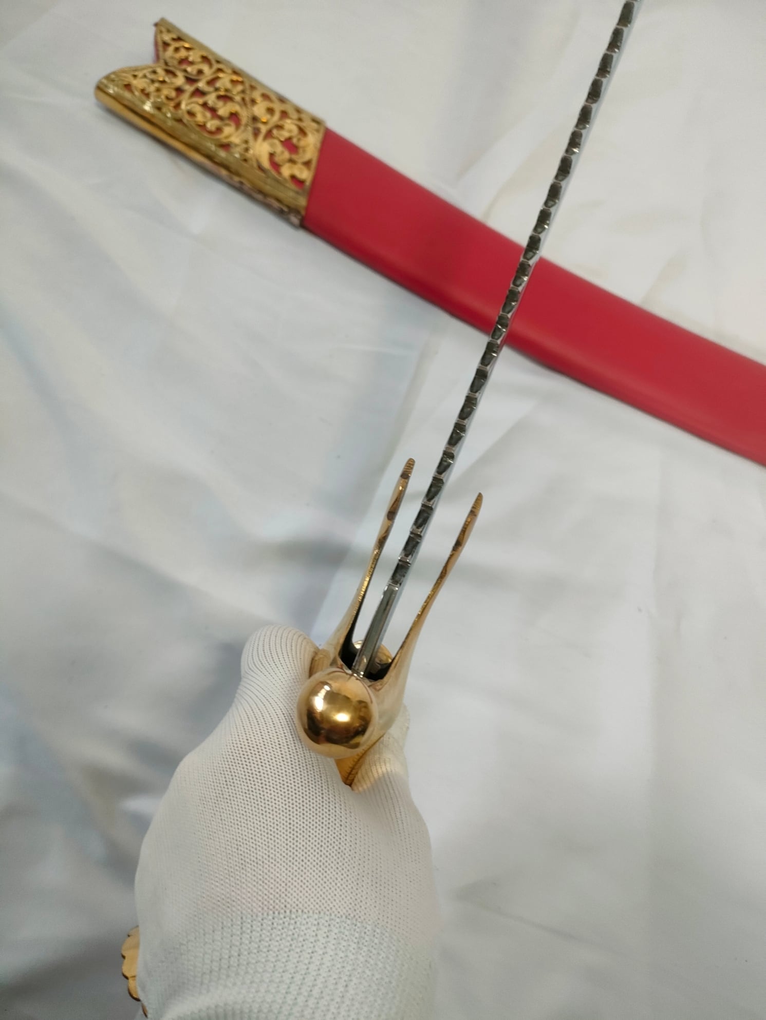 当製品は、そんな歴史上の刀剣をイメージしたレプリカで、儀礼刀らしい華やかな金具類や、鋸歯状をしたユニークな樋入り刀身が魅力的。