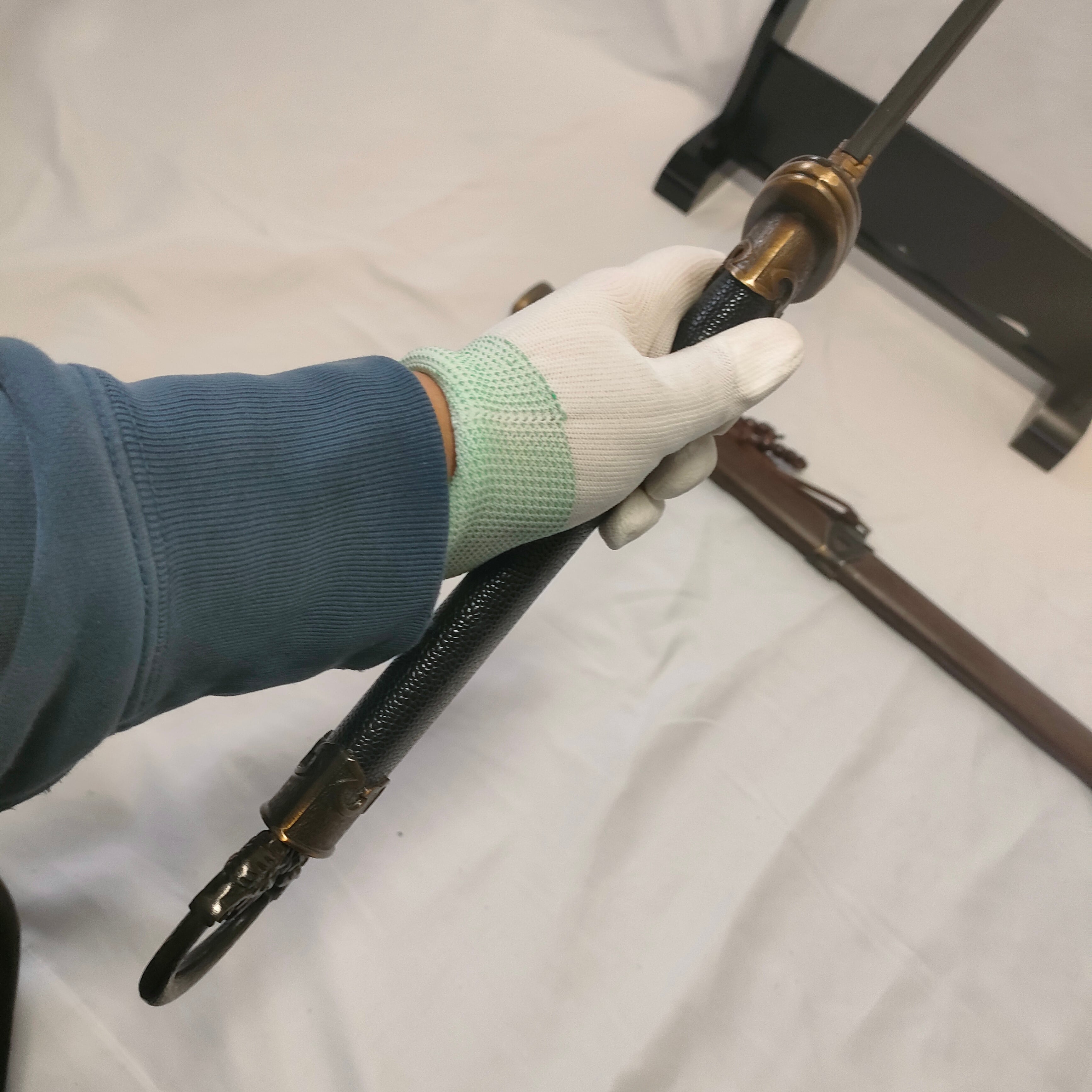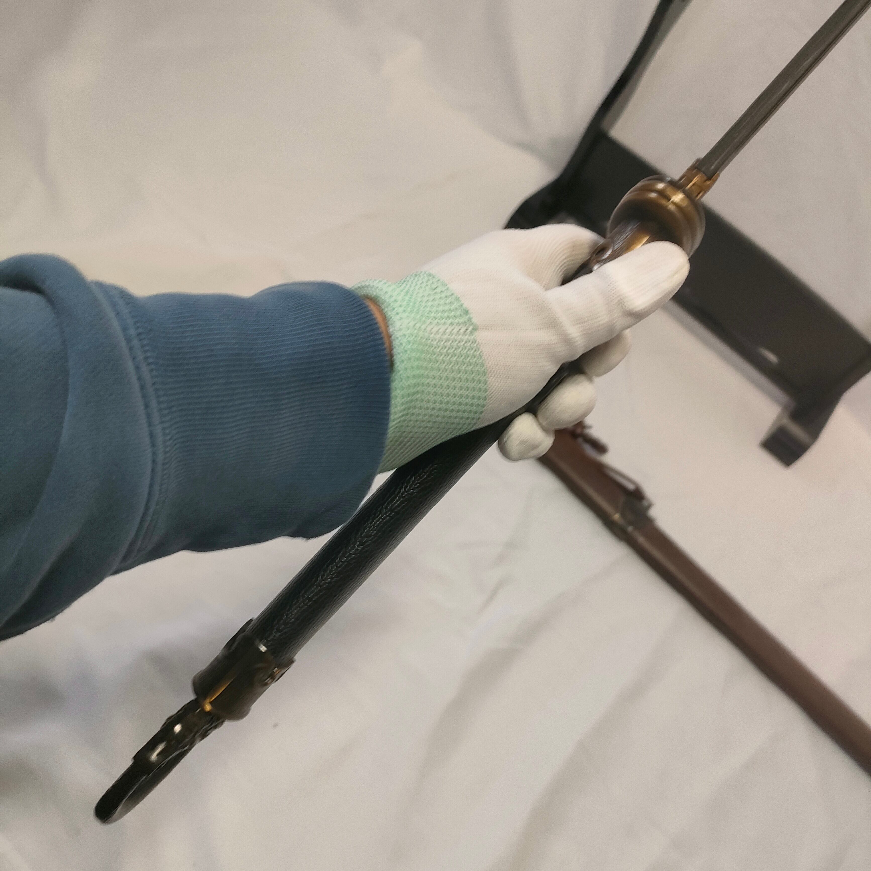 素材:繊維強化樹脂製刀身、合皮巻の木柄、木鞘、合金装具類