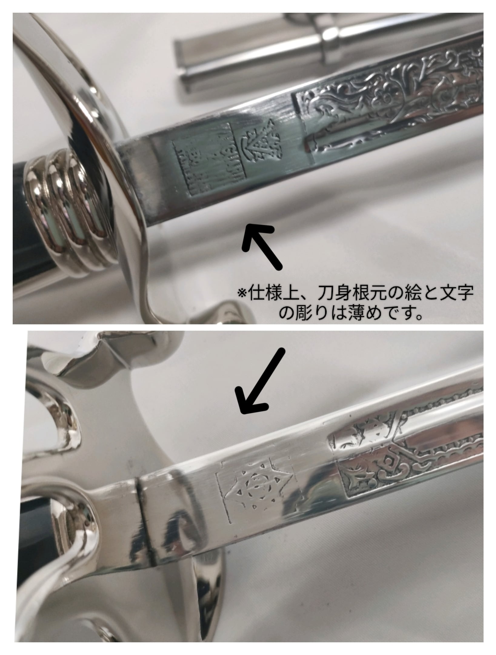 ・仕様上、刀身根元の絵と文字の彫りは薄めです(画像末参照)。
