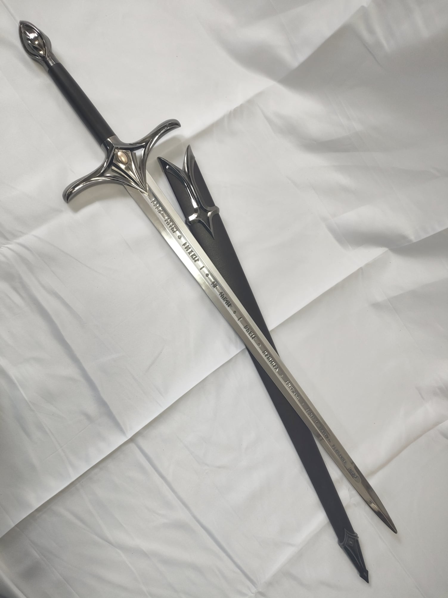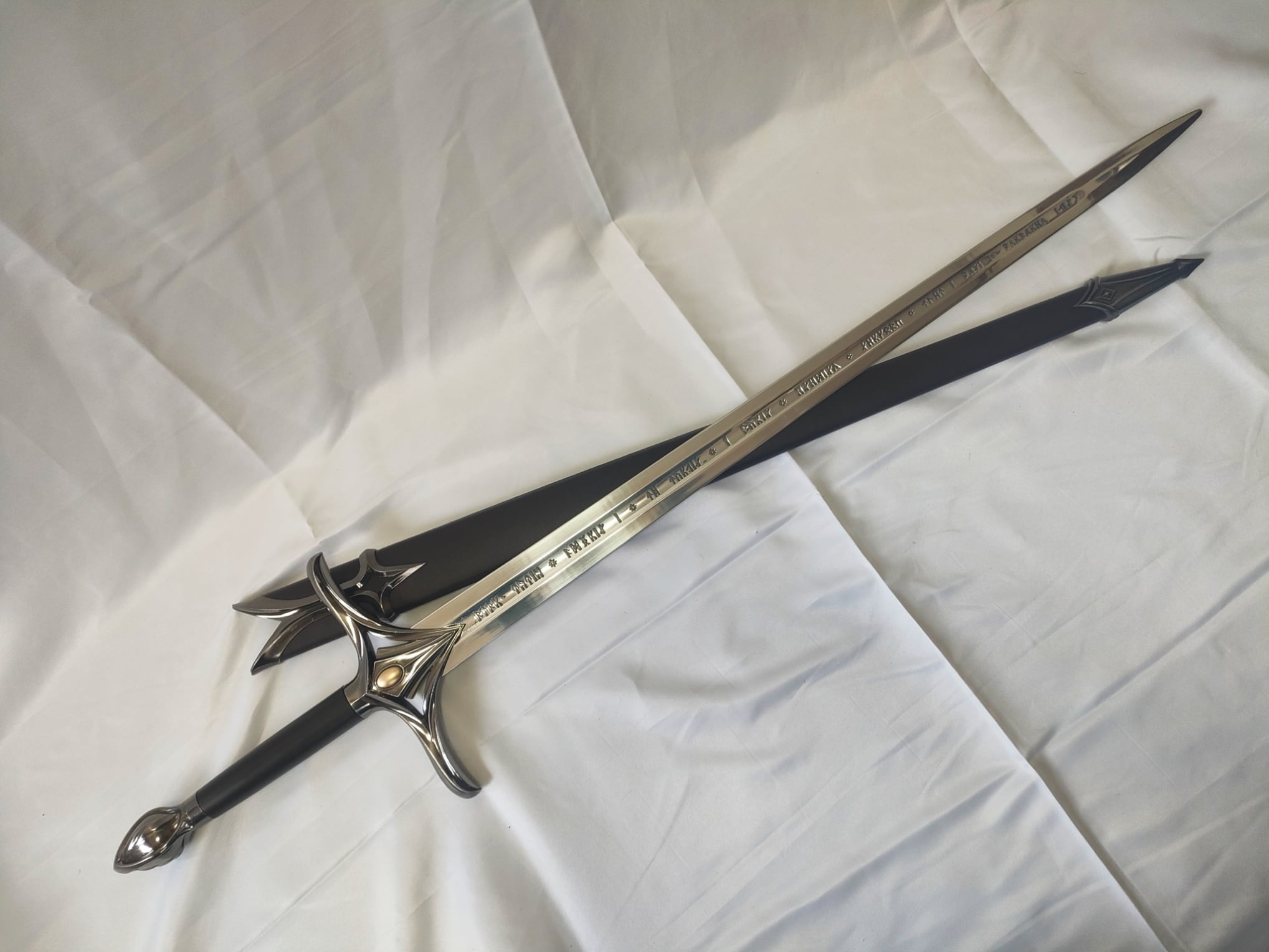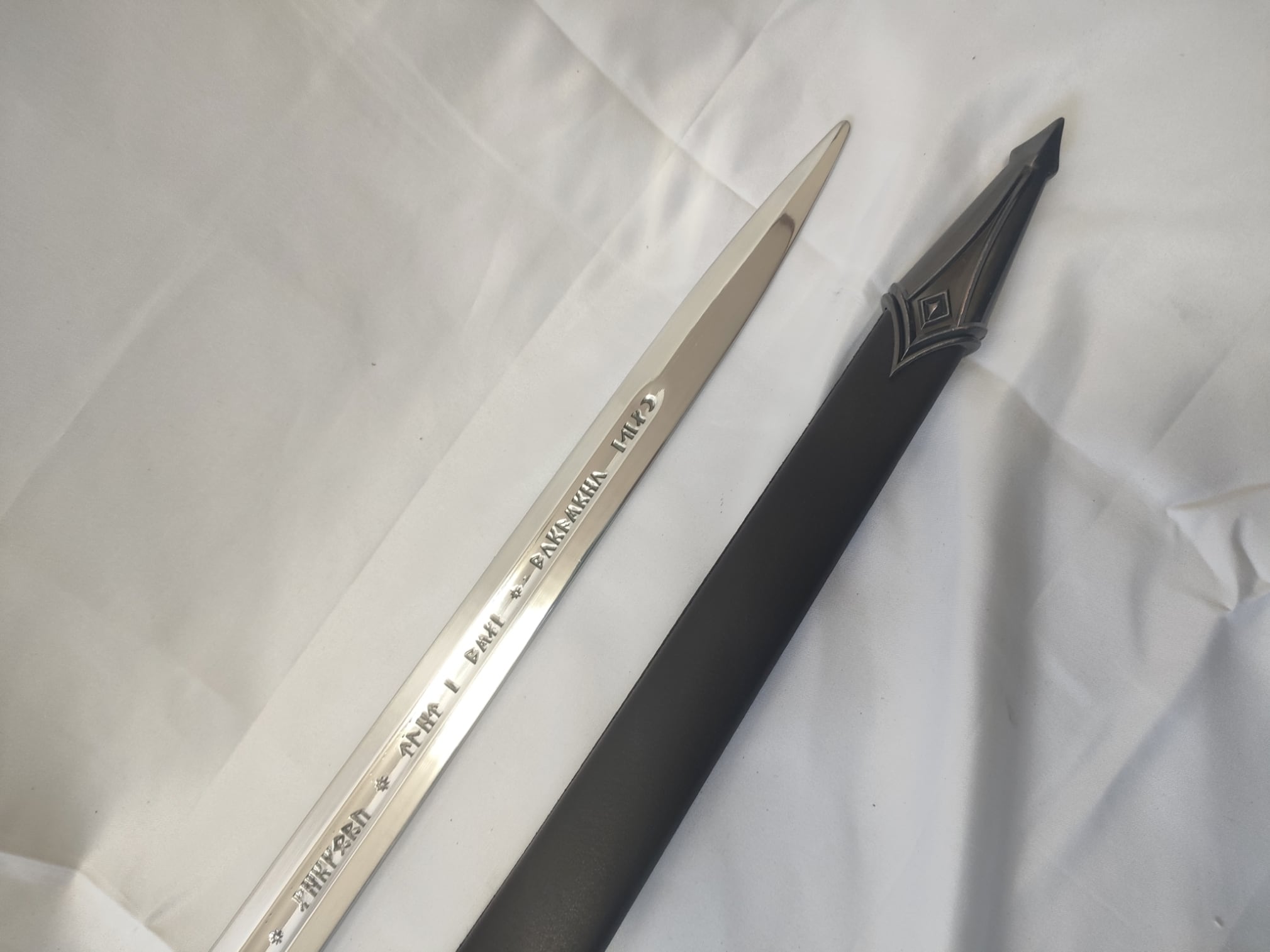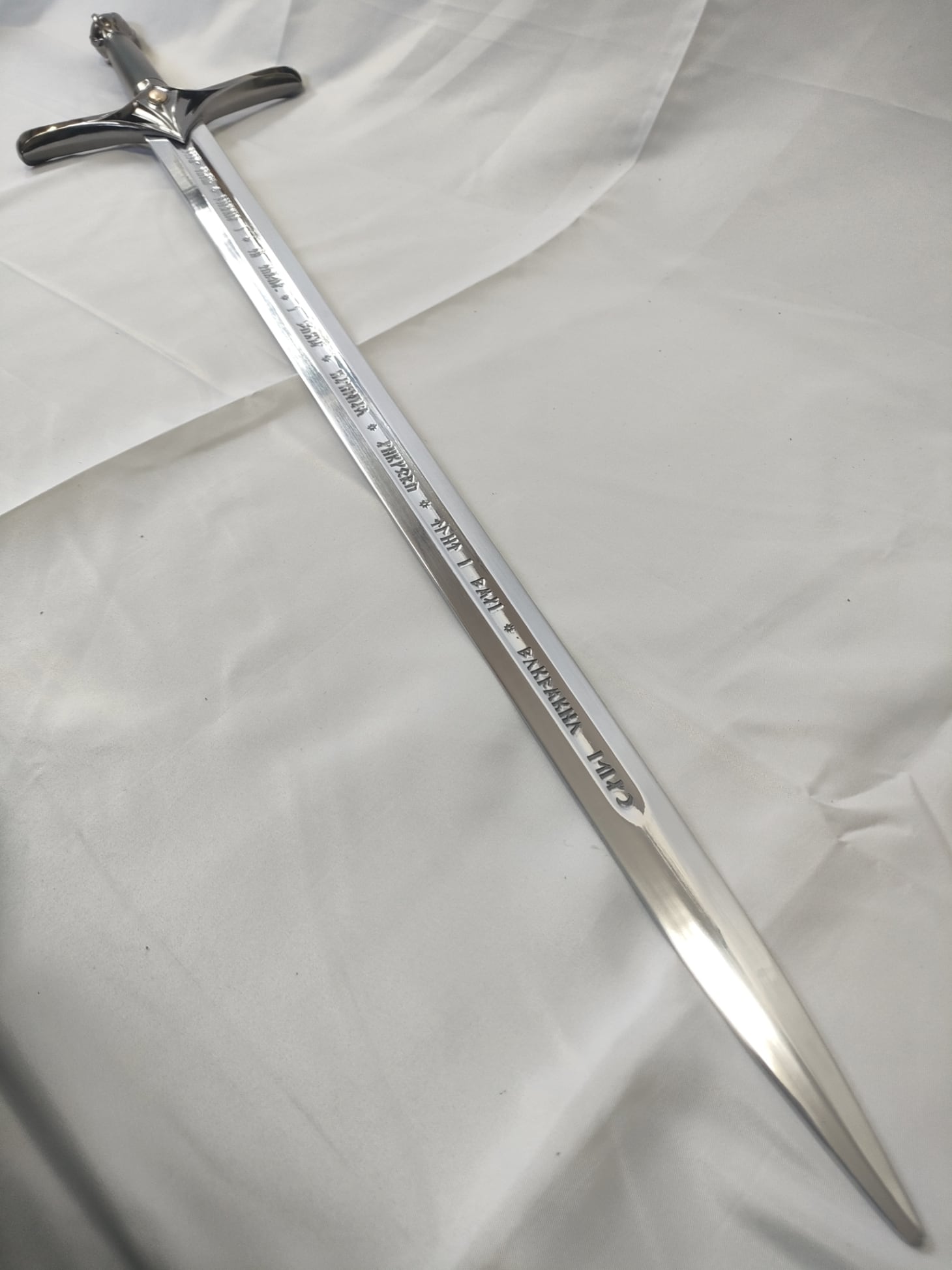 ファンタジー的なデザインの片手洋剣。刀身はアルミ合金製。刀身に文字が彫られている。