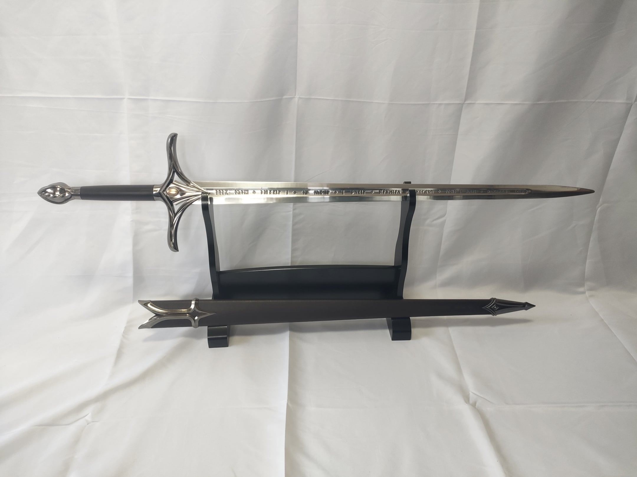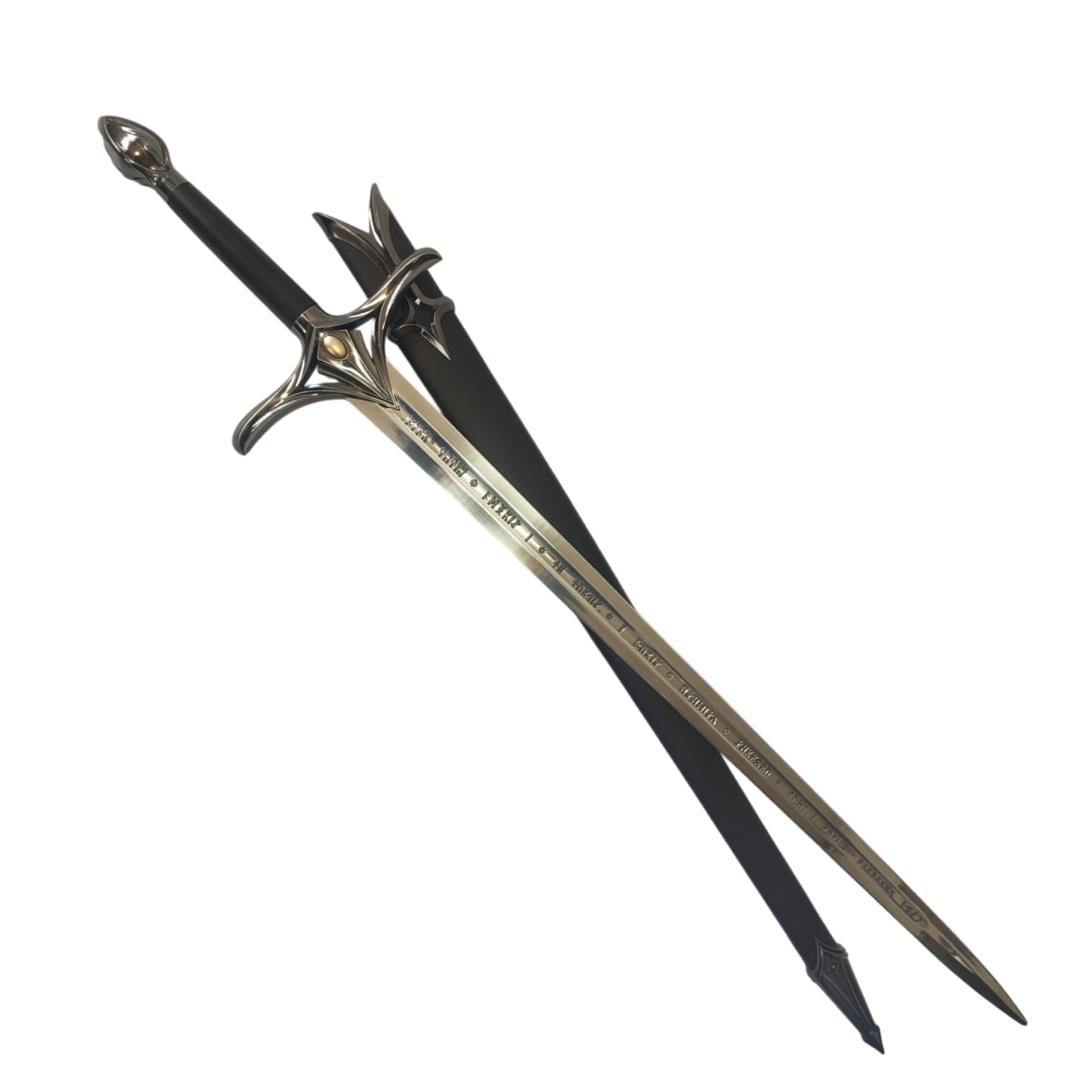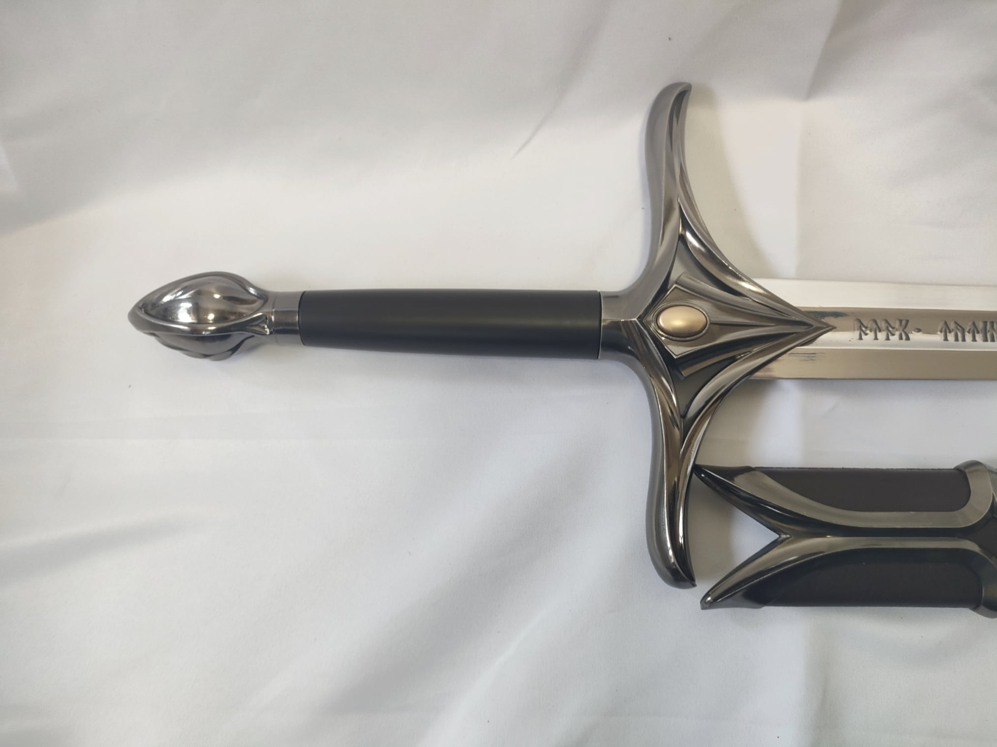 ファンタジー的なデザインの片手洋剣。刀身はアルミ合金製。刀身に文字が彫られている。