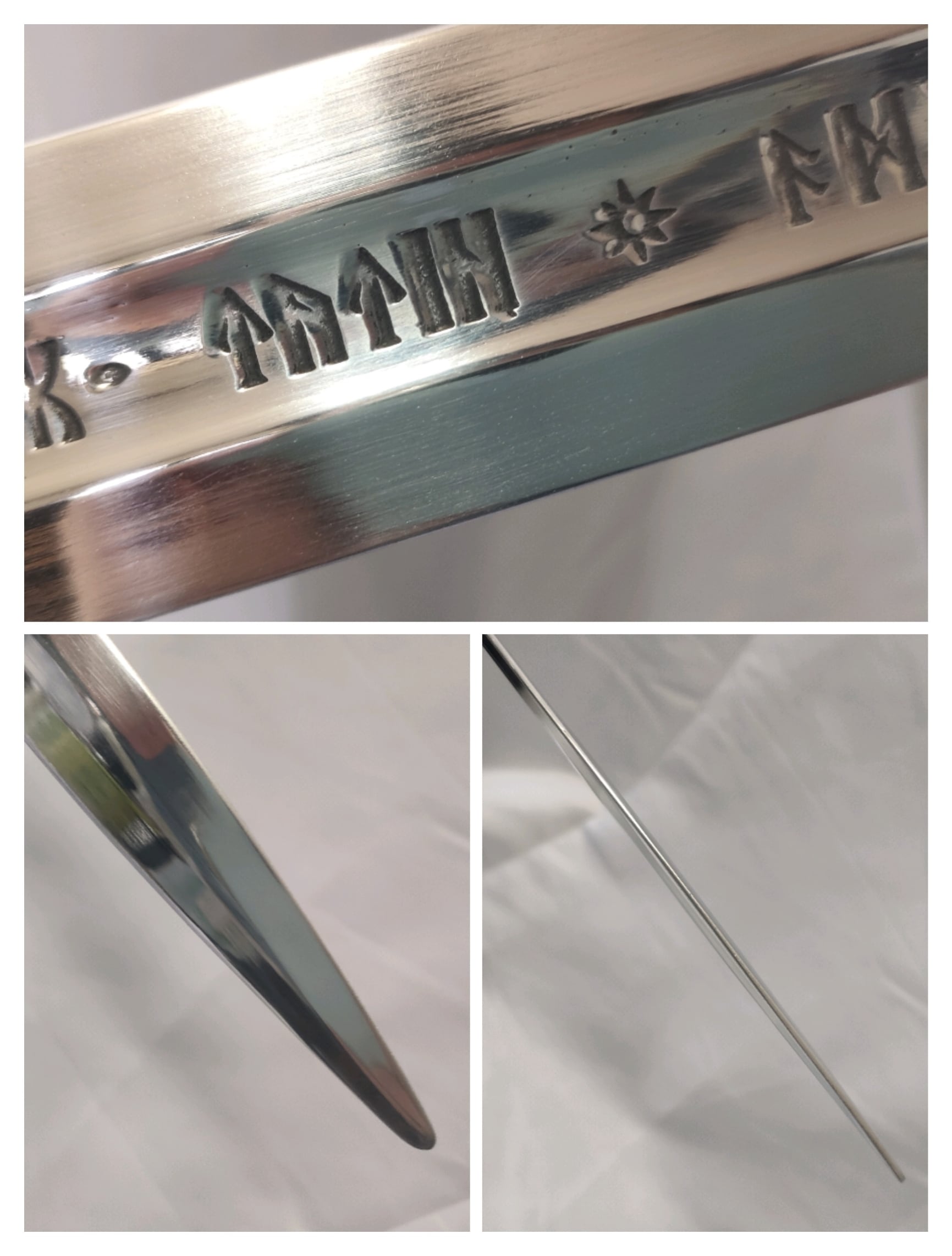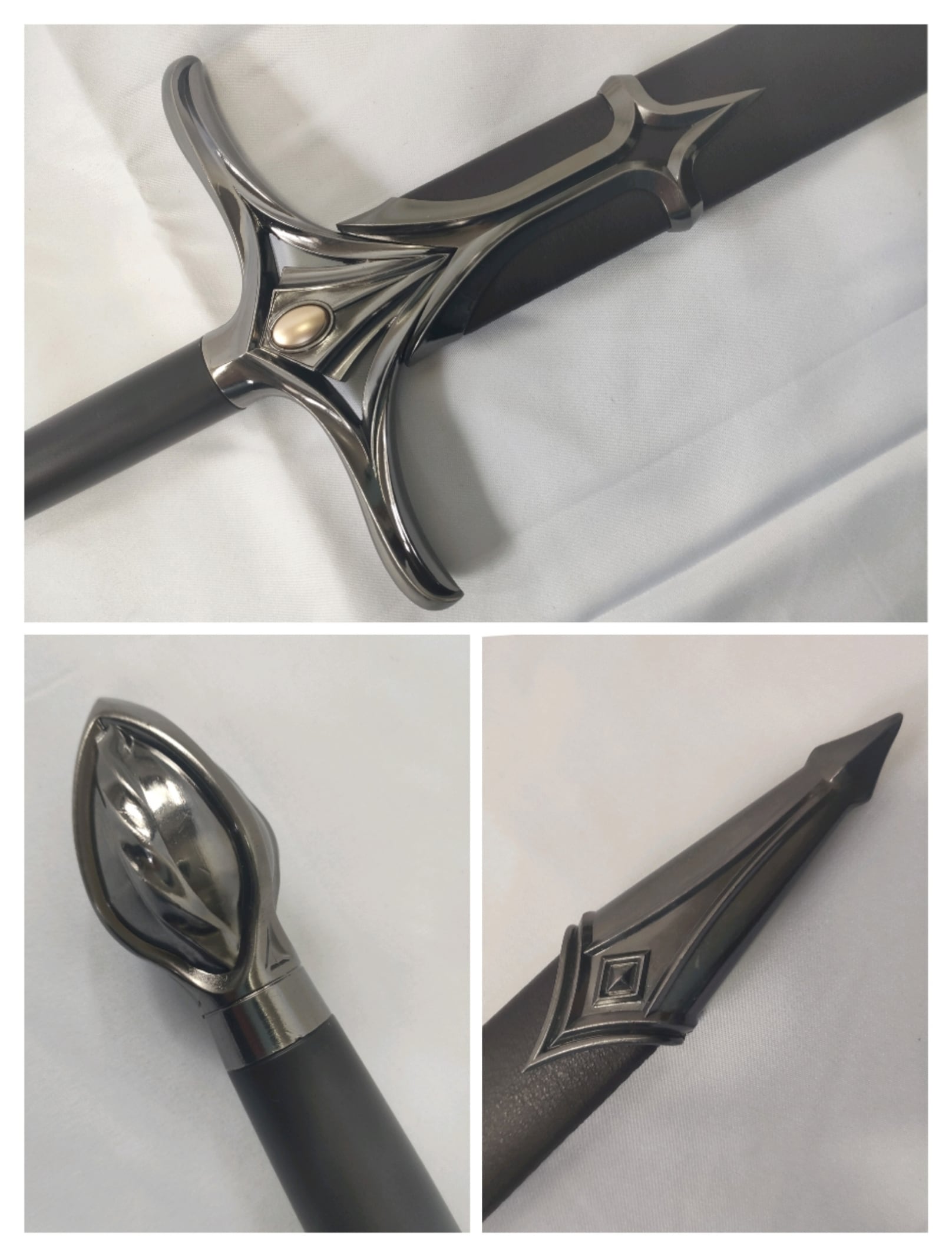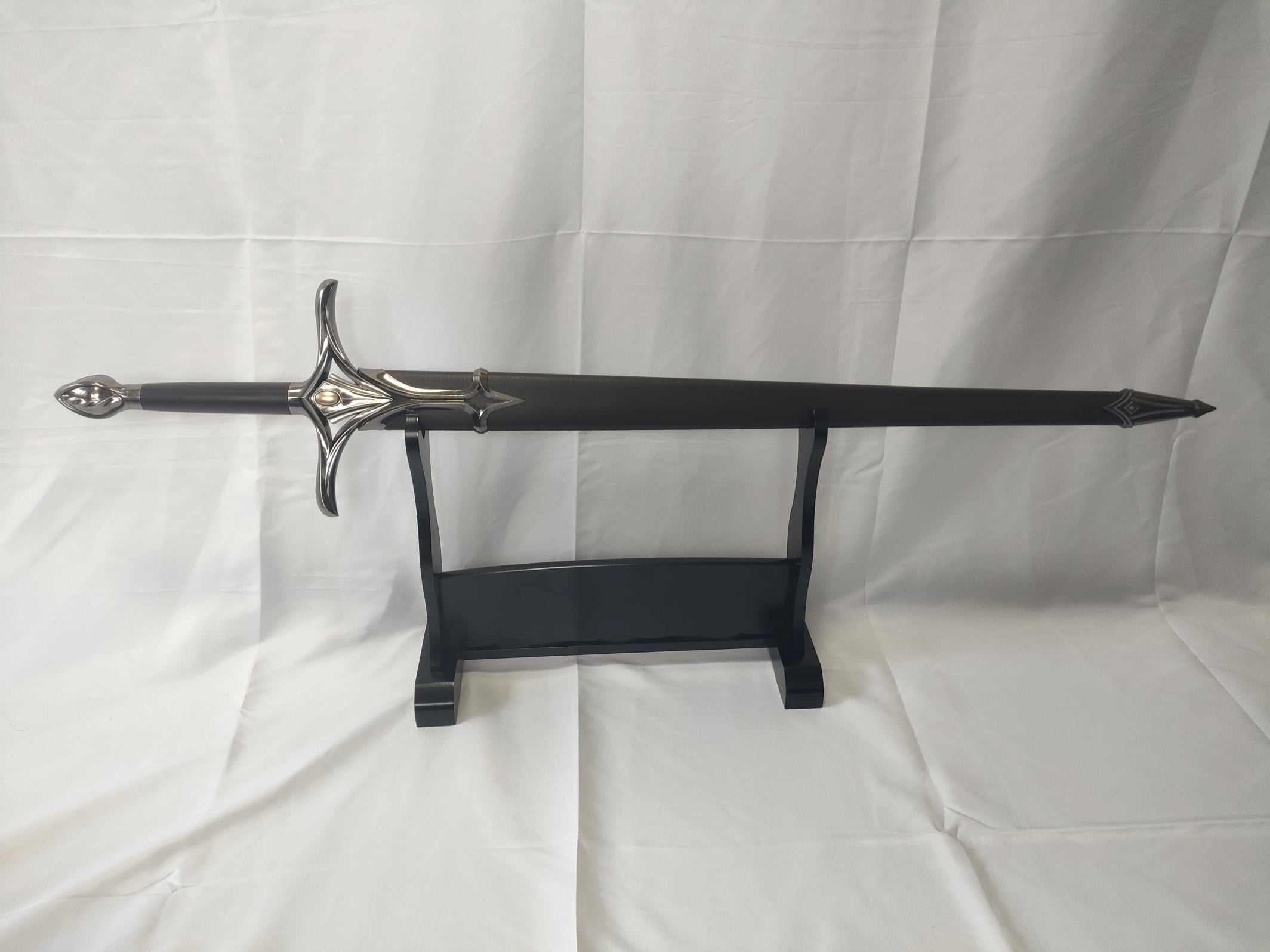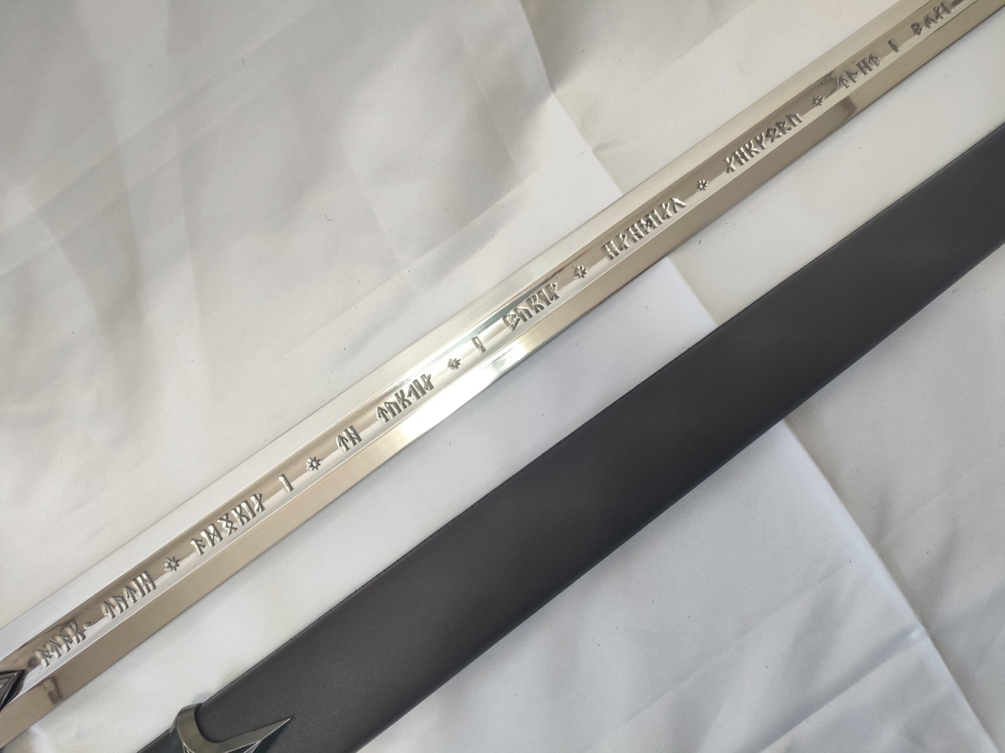 ファンタジー的なデザインの片手洋剣。刀身はアルミ合金製。刀身に文字が彫られている。