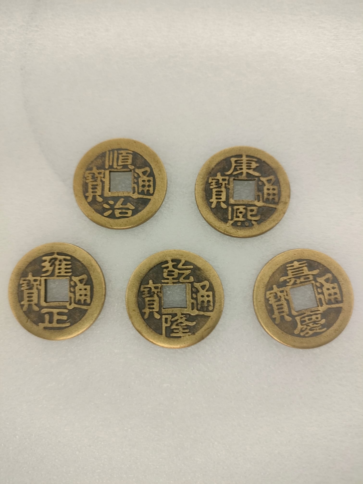 五帝(順治、康熙、雍正、乾隆、嘉慶)時代の古銭のレプリカセット。